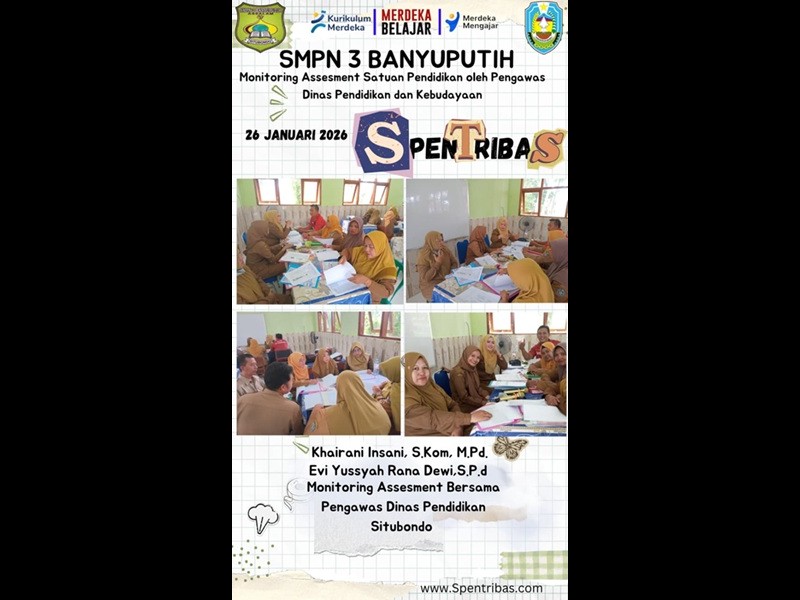 Pada tanggal 26 Januari 2026 SMP Negeri 3 Banyuputih Kegiatan monitoring Asesmen Satuan Pendidikan di SMP Negeri 3 Banyuputih dilaksanakan oleh Pengawas Dinas Pendidikan sebagai upaya untuk memastikan pelaksanaan asesmen berjalan sesuai dengan ketentuan, standar, dan prinsip penilaian yang berlaku. Berdasarkan hasil monitoring, pelaksanaan asesmen telah terlaksana dengan tertib, lancar, dan sesuai dengan perencanaan yang telah disusun oleh satuan pendidikan.